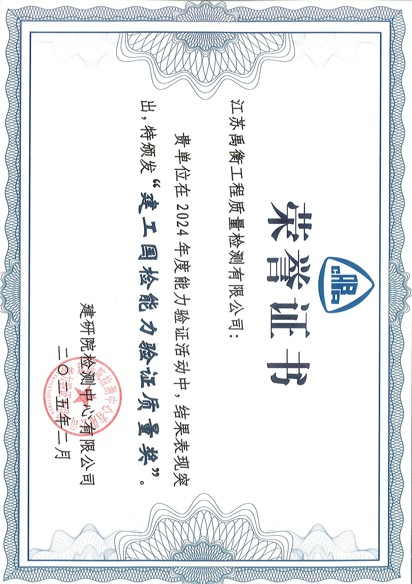 我公司2024年度組織人員參加能力驗(yàn)證15次,涉及12項(xiàng)產(chǎn)品共計(jì)22個(gè)參數(shù)。本年度能力驗(yàn)證分別由長三角地區(qū)市場監(jiān)管局和建研院檢測中心有限公司(市場監(jiān)管總局能力驗(yàn)證實(shí)施單位)組織,均取得滿意結(jié)果證書,并獲得中國建筑科學(xué)研究院檢測中心有限公司頒發(fā)的“建工國檢能力驗(yàn)證質(zhì)量獎(jiǎng)”。